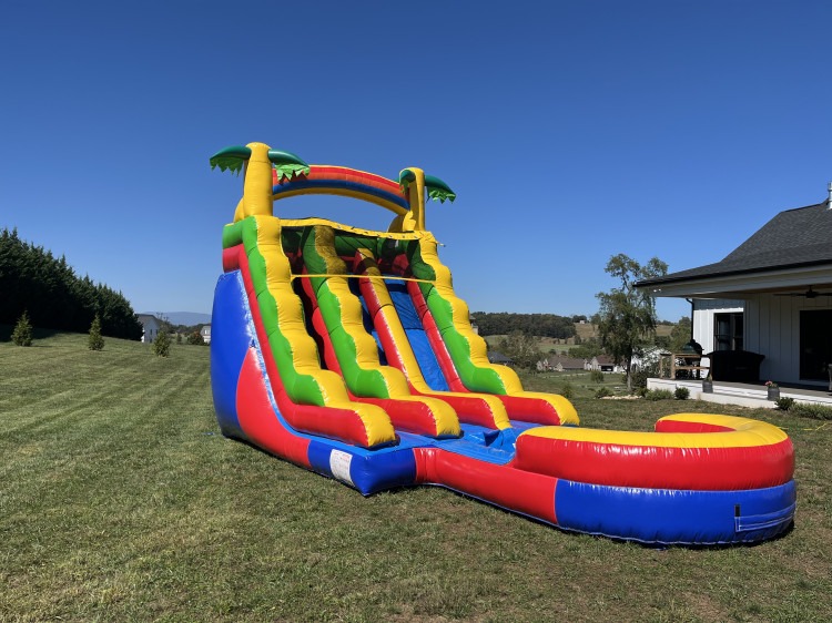 Standing 18 feet tall and featuring bright, bold colors, this dual lane slide is a show-stopper at any event – from backyard parties and school carnivals to church festivals and summer camps. Riders climb up the central stairway and choose their lane before zooming down into the oversized splash pool at the bottom.