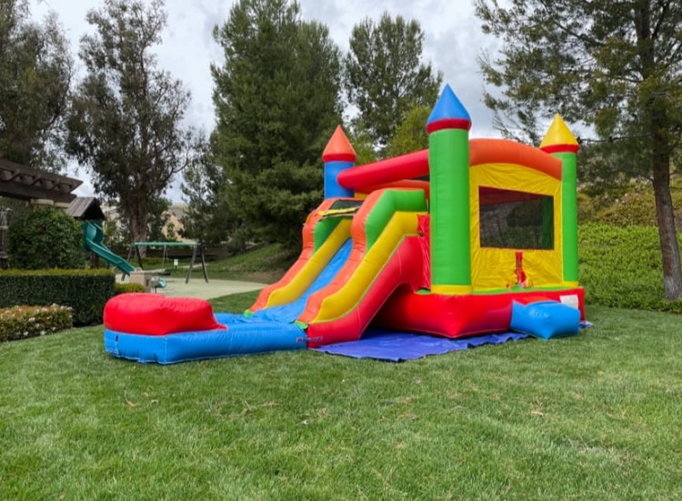 Fiesta Combo Bounce HouseFiesta Package:Fiesta Combo Bounce House1Dropdown13260821_29995670000 Bring the party to life with the Fiesta Combo Bounce House — a bright, castle-style inflatable that combines a roomy bounce area with an attached sliding lane for extra fun. Kids step up the small entrance ramp into a safe, netted jumping area and they’ll find a built-in basketball hoop. When it’s time for a change of pace, they can climb the interior steps for a quick trip down the slide. The colorful, durable vinyl construction and low-profile design make this combo ideal for backyard birthday parties, school events, or community gatherings.Dimensions: 29’ L x 13’ W x 13’ H (approx.)