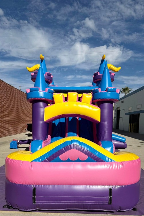Bring the magic of a royal adventure to your next event with this vibrant castle-themed bounce house combo! Featuring bold pink, purple, blue, and yellow colors, this inflatable is designed to capture attention and spark excitement for kids of all ages. The spacious jumping area offers plenty of room for bouncing fun, while the attached slide adds an extra thrill as children climb up and glide down again and again.